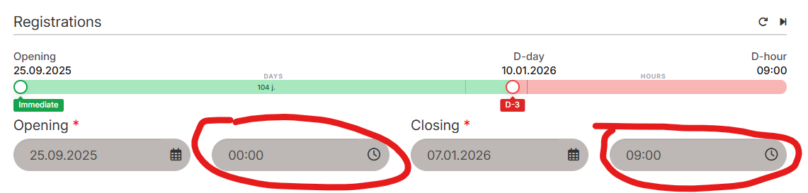 - Il est maintenant possible de préciser les horaires de début et de clôture d'inscription (jusqu'à présent seules les dates étaient possibles)